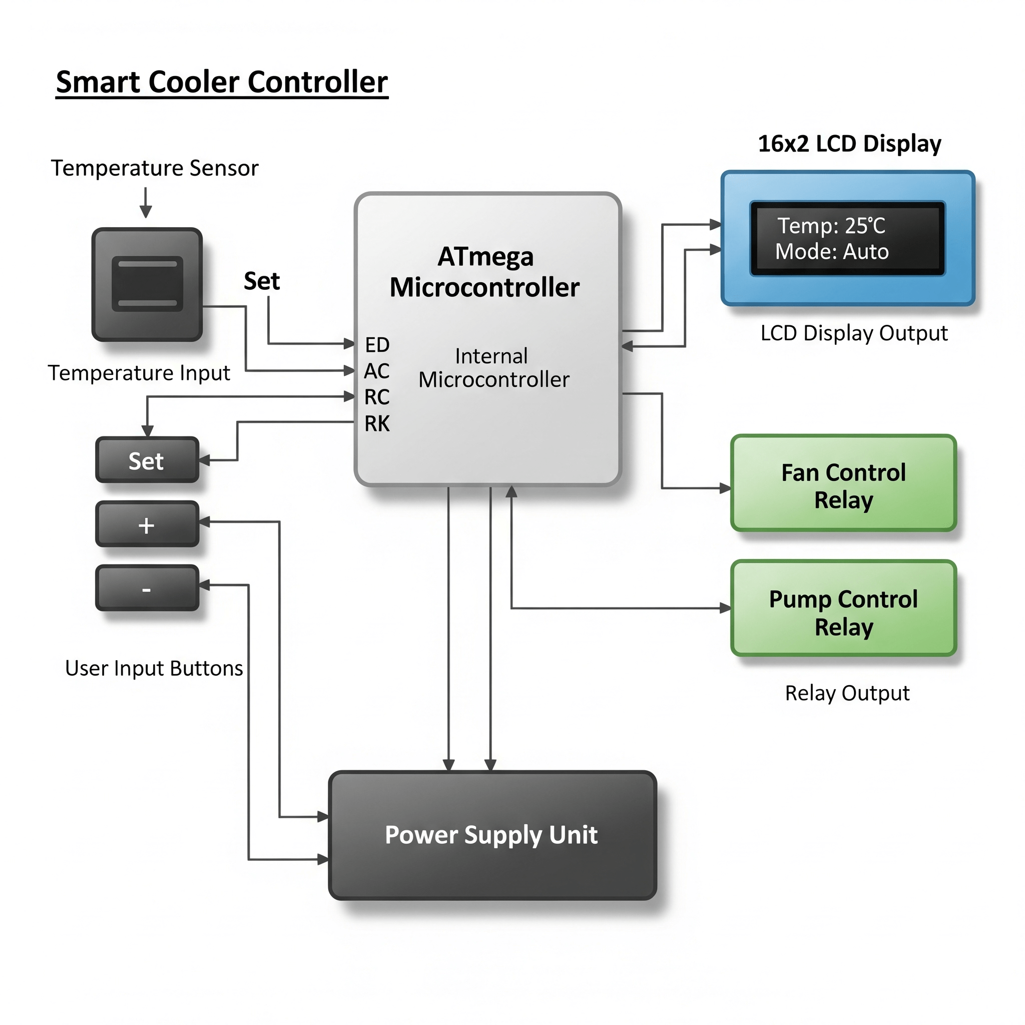 This interactive diagram demonstrates the high-level architecture of the Smart Cooler Controller. Hover over any component to view its function, and click **Run Simulation** to see the logical flow of data and power through the system. Please note that this is a simplified representation for conceptual purposes.